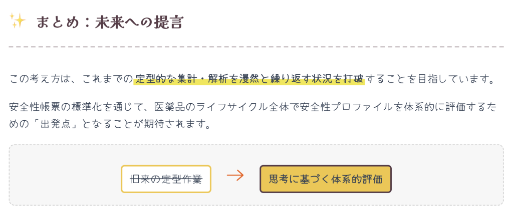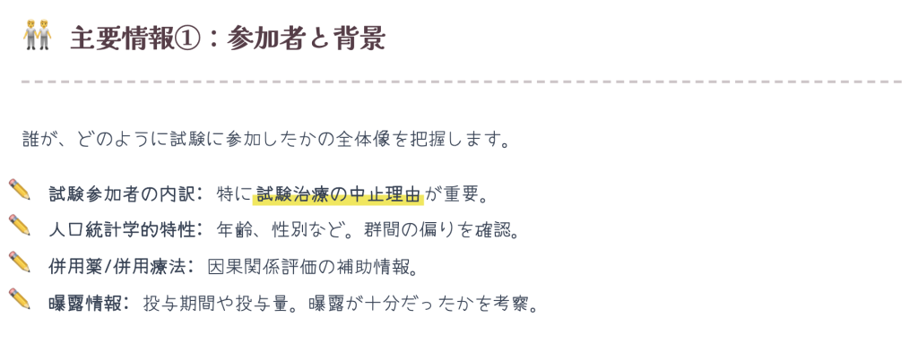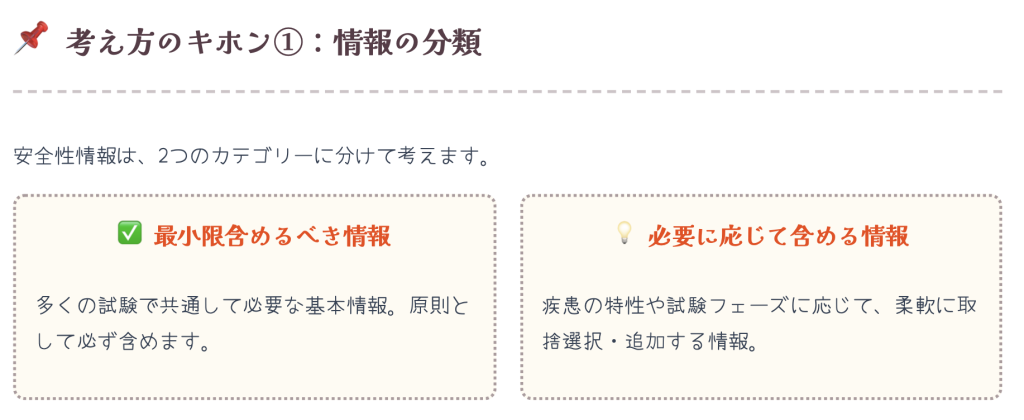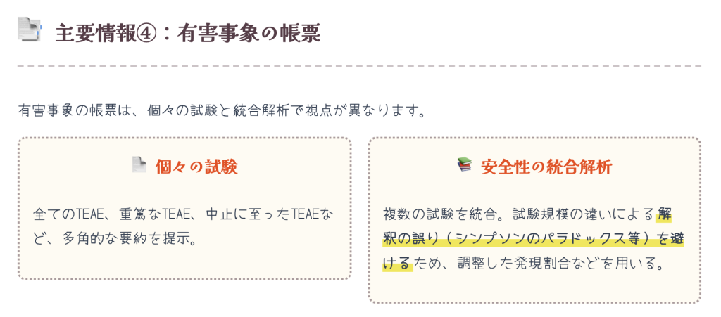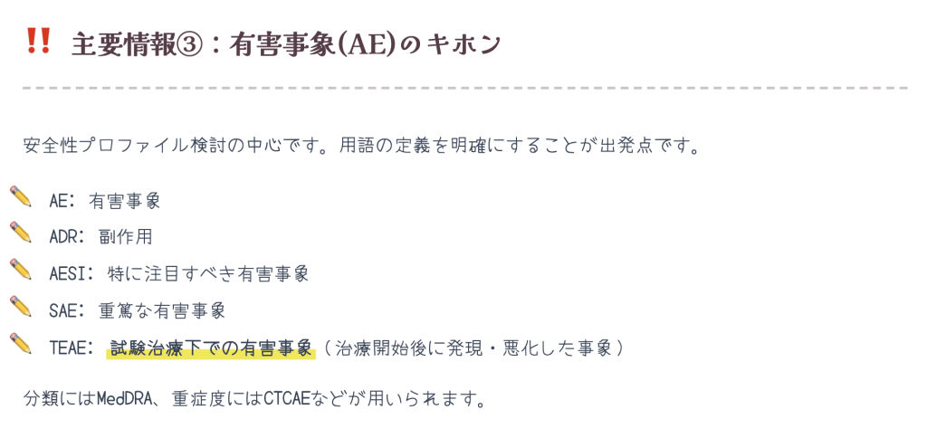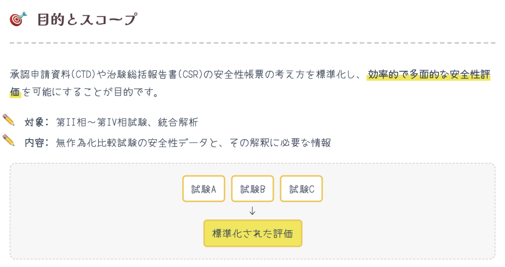 治験でとても重要な観点「安全性」について理解を深めたく、日本製薬工業協会医薬品評価委員会データサイエンス部会が2023年2月に発行した「臨床試験の安全性帳票に関する基本的考え方」を確認し、動画・図解を作成いたしました。